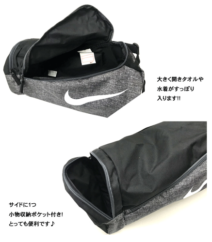 メーカー希望小売価格はメーカー商品タグに基づいて掲載しています商品名 NIKEボストン型プールバッグ 品番 1984903 素材 ポリエステル 生産国 中国製 サイズ 42×22×22cm(14L) 特徴 NIKE(ナイキ)ボストン型プールバッグ Wファスナーで大きく開口するから、出し入れがしやすく サイドには小物が入るポケットがある使い勝手がいいスイムバッグ。