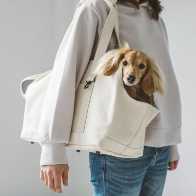 肩から下げてちょうどいい感じのところに愛犬の顔が来るので、愛犬も気分上々? 中敷が入ってるので肩掛けしても一定の幅をキープ、少しの移動ぐらいにハードタイプのキャリーは大きすぎと感じるオーナー様にもぴったり。